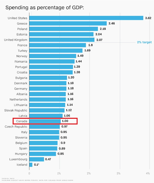 To put the 2% of GDP into some context, NATO countries are targeting defense spending of 2% of GDP. As the chart below shows, Canada is only spending 1% of GDP on defense, which is especially important given Donald Trump’s complaints about defense spending levels of NATO members. In effect, real estate transfer fees are twice the size of the Canadian defense budget.