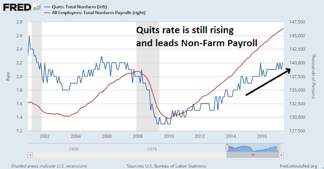Ozimek went on to state that the prime age labor market still had some slack left before wage inflation reaches 3.5%-4.0% wage growth. As last week’s JOLTS reports showed that the all important “quits” rate continues to rise, this signals continuing labor market strength.