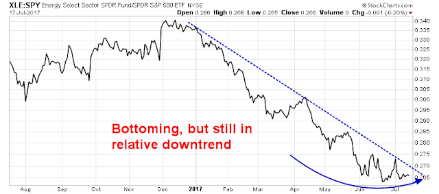 As well, energy equities remain in a relative downtrend against the market. Even though the XLE/SPY ratio shows signs of bottoming, I would prefer to see a rally through the relative downtrend line before embracing the rising inflation trade.