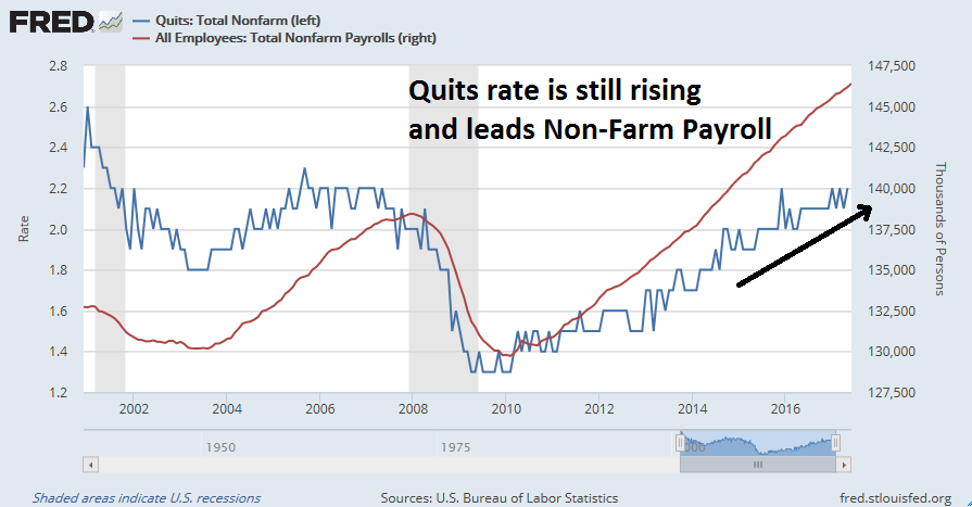 Ozimek went on to state that the prime age labor market still had some slack left before wage inflation reaches 3.5%-4.0% wage growth. As last week’s JOLTS reports showed that the all important “quits” rate continues to rise, this signals continuing labor market strength.