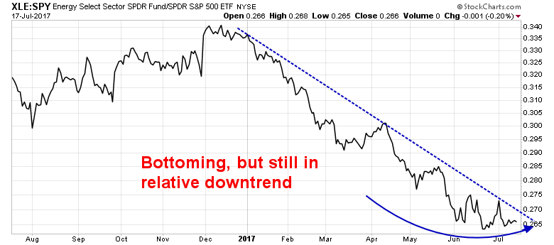 As well, energy equities remain in a relative downtrend against the market. Even though the XLE/SPY ratio shows signs of bottoming, I would prefer to see a rally through the relative downtrend line before embracing the rising inflation trade.