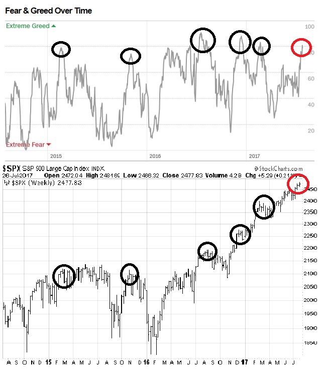 The Fear and Greed Index hit 81 yesterday, but retreated to 79 today. In the past, the market has either consolidated for a few weeks or weakened from these levels. As a reminder, the corrective action that began in late 2016 began when this index peaked in the high 70`s.
