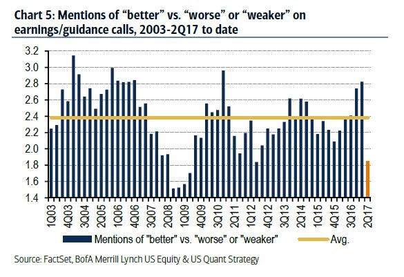 Savita Subramanian at BAML confirmed my observation of negative revisions with a report entitled, “Good results, ‘meh’ guidance’. She found that Q3 2017 guidance was well below the historical average.