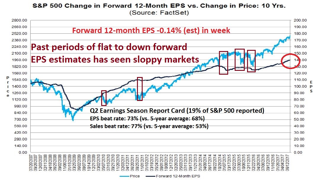I wrote on the weekend that I was seeing the unusual condition where Q2 EPS and sales beat rates were well ahead of historical averages, but forward 12-month estimate revisions was falling. I then questioned if the negative revision was a data blip (see What would a contrarian do?).