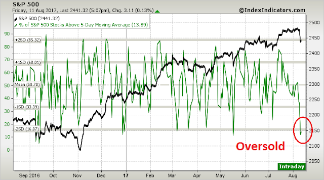 Breadth indicators from Index Indicators show that the market is oversold on a short-term (1-2 day) basis.