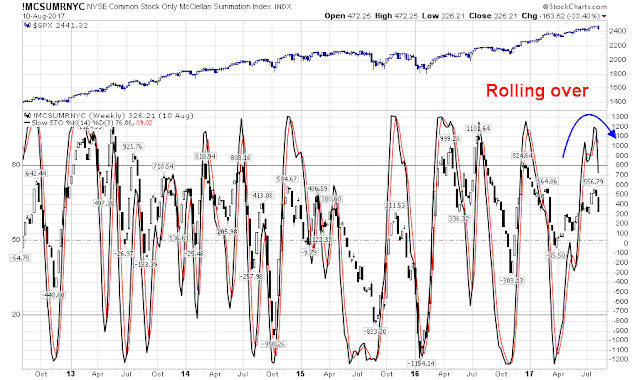 The NYSE Common stock only McClellan Summation Index is just starting to roll over. This is an intermediate term indicator with a time horizon of 2-4 months. From this technical perspective, it would be difficult to believe that a pullback could be complete in such a short time.