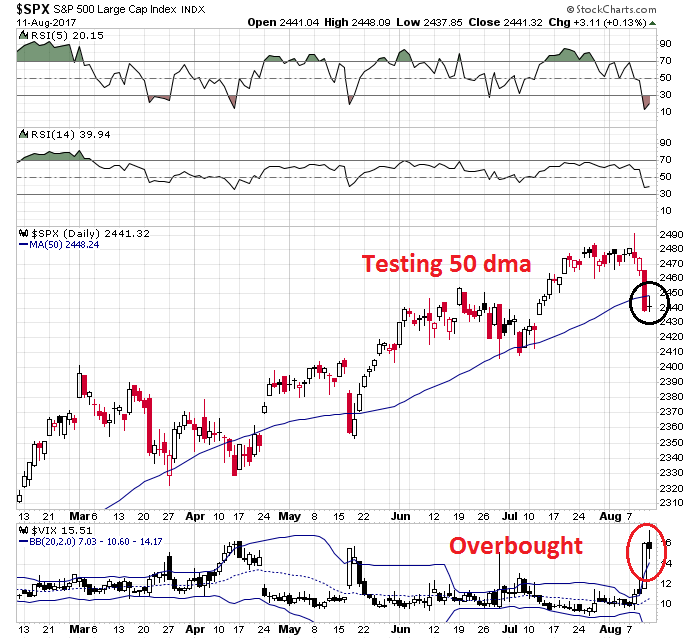 Two of my trading models (see Three bottom spotting techniques for traders) have flashed oversold signals too. The VIX Index is trading above its upper Bollinger Band, indicating an oversold condition as the SPX tests its 50 day moving average. Friday’s doji candle could indicate market indecision at a critical junction, which could indicate a short-term turning point.
