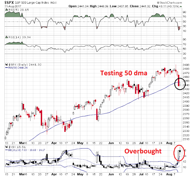 These conditions are suggestive of an oversold rally over the next few days within the context of a longer term corrective impulse that is still incomplete. The market has reached its first critical test, namely a uptrend line on SPX, and breadth support on % bullish and % above the 200 dma. The most likely scenario is to see a bounce into the 2460-2470 region, which sets a lower high, followed by additional weakness in the manner of the sell-off in the summer of 2015.