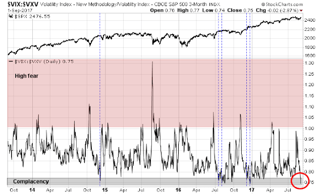 The term structure of the VIX shows that sentiment is now signaling complacency. Past episodes of complacency, which are marked by vertical lines, has seen the market struggle to advance. At a minimum, expect a neat-term flat to down bias in prices.