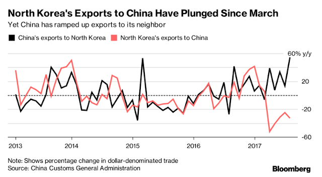 Further, the semi-official Communist Party organ Global Times was restrained in its reaction to the H-bomb test, and advised that “China needs a sober mind and must minimize the risks Chinese society has to bear”. Moreover, it stated that China “should avoid resorting to rash and extreme means by imposing a full embargo on North Korea” by “[cutting] off the supply of oil to North Korea or even [closing] the China-North Korea border”. As for the criticism that China is not putting enough pressure on North Korea, Beijing can point to the fact that North Korean exports to China has collapsed since March (chart via Bloomberg).