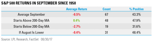 Welcome to September. Looking forward, this month is known to be seasonally bearish. Jeff Hirsch of Trader`s Almanac found that September was the worst month of the year, based on seasonal factors.