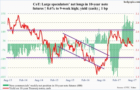 What if the market is wrong? Current market positioning (via Hedgopia) shows a crowded long by large speculators, or hedge funds, in the 10-year note and long Treasury bond.