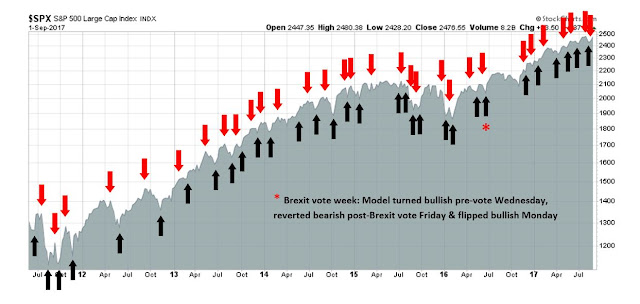 My inner trader uses the trading component of the Trend Model to look for changes in the direction of the main Trend Model signal. A bullish Trend Model signal that gets less bullish is a trading “sell” signal. Conversely, a bearish Trend Model signal that gets less bearish is a trading “buy” signal. The history of actual out-of-sample (not backtested) signals of the trading model are shown by the arrows in the chart below. Past trading of the trading model has shown turnover rates of about 200% per month.