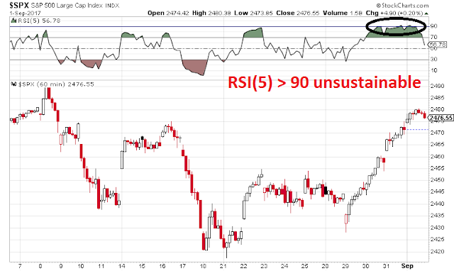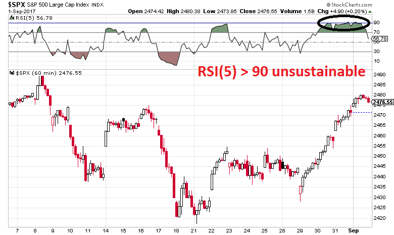 On a very short-term basis, the hourly chart of SPX shows RSI-5 surging above 90, which are levels that are rarely sustainable for a very long time.