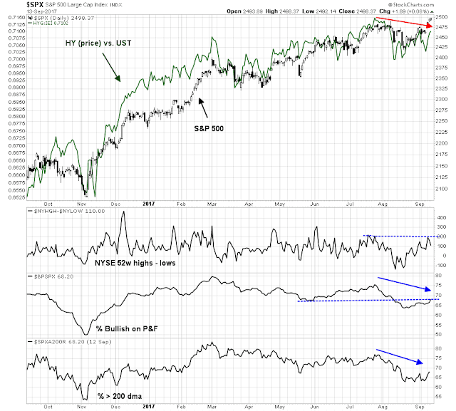 There are also negative divergences in credit market risk appetite, as measured by the relative performance of junk bonds, as well as net NYSE highs-lows, % bullish and % above 200 dma indicators.