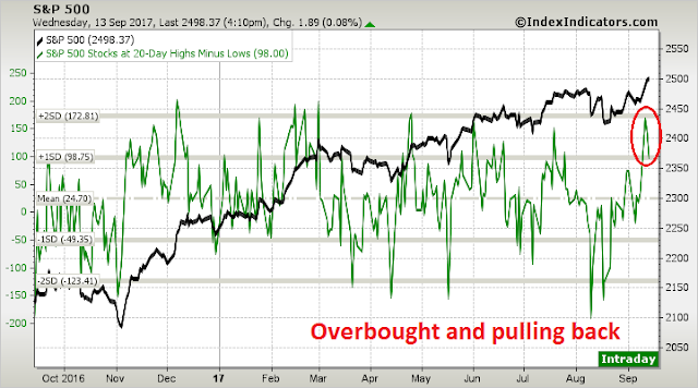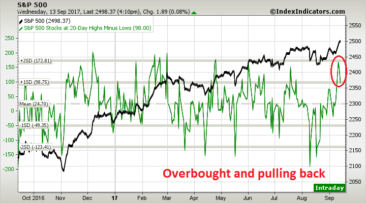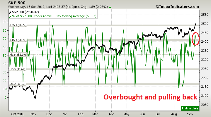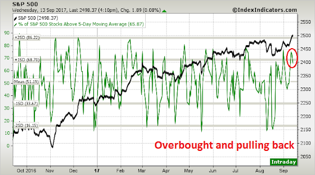 These breadth indicators from Index Indicators also show that the market was overbought on multiple time frames and begun to pull back. Here is % above 5 dma (1-2 day time frame).