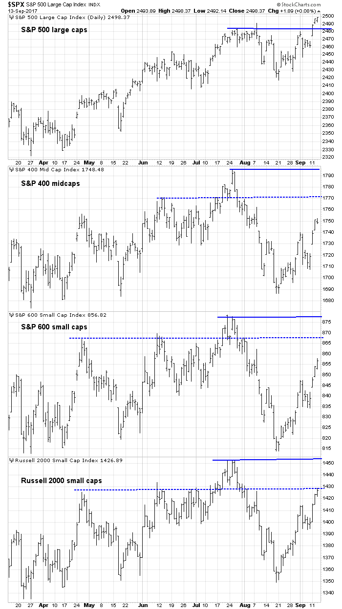 These readings suggest to me that the market’s assault on the new highs is likely to fail in the short term. The market action in the last few weeks is that of a defined uptrend changing into a trading range. This is evidence of a period of consolidation. The next key test will occur in the likely pullback. Will it make a lower high, or will it weaken to test the August lows?