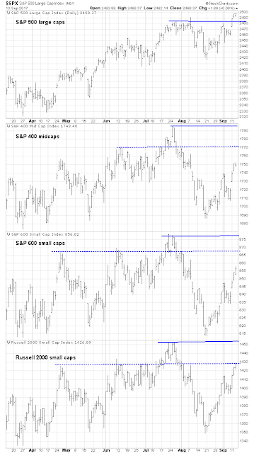 On the other hand, other indicators of breadth and risk appetite have not confirmed the fresh highs. While the large cap SPX has made new highs, the mid and small cap indices are lagging, which is a cautionary message about the generals leading but the troops not following the charge.
