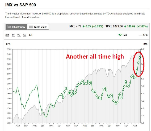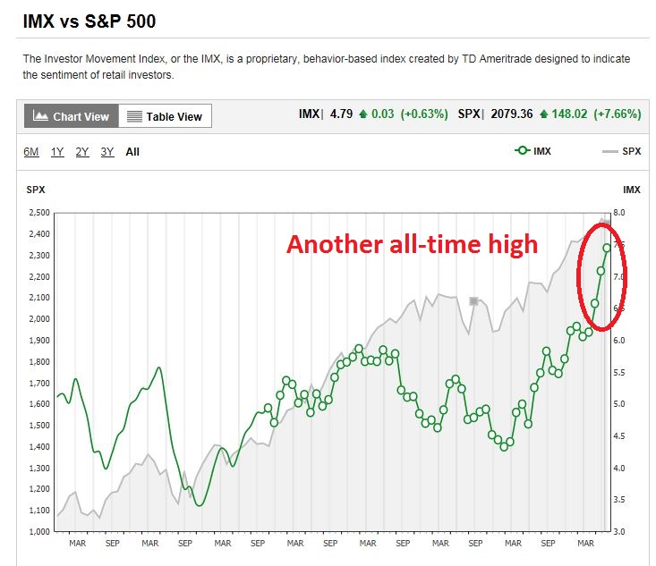 An update of the TD-Ameritrade Investors Movement Index, which measures Ameritrade client bullishness, shows that readings have reached another all-time high.