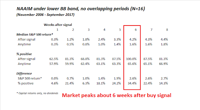 I had highlighted an unusual contrarian buy signal in my last post (see Round number-itis at 2500). NAAIM sentiment, which is reported weekly, turned anomalously bearish last week and fell below its lower Bollinger Band. Past episodes of such occurrences have turned out to be very good contrarian buy signals.