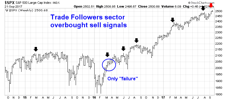 Excluding the current signal, there were six similar sell signals since 2015. In five of the six instances, the market either declined or stalled. There was only one failed signal, which occurred in March 2016, though the market did decline slightly the week after that signal. Here is a list all of the past Trade Follower posts of with similar sell signals: