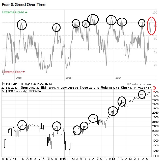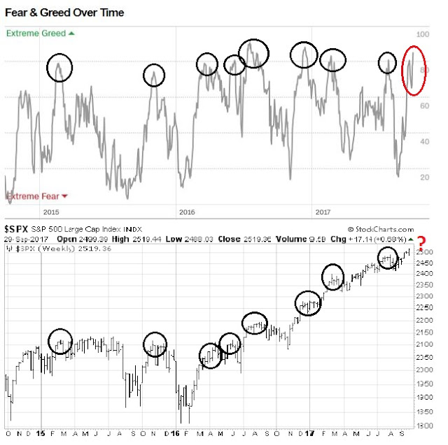 As well, psychology has become overly bullish. The Fear and Greed Index closed at 85 after hitting an intra-day high of 90 on Friday. If history is any guide, such levels has seen the market advance either consolidate sideways or pull back.
