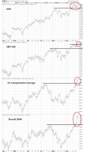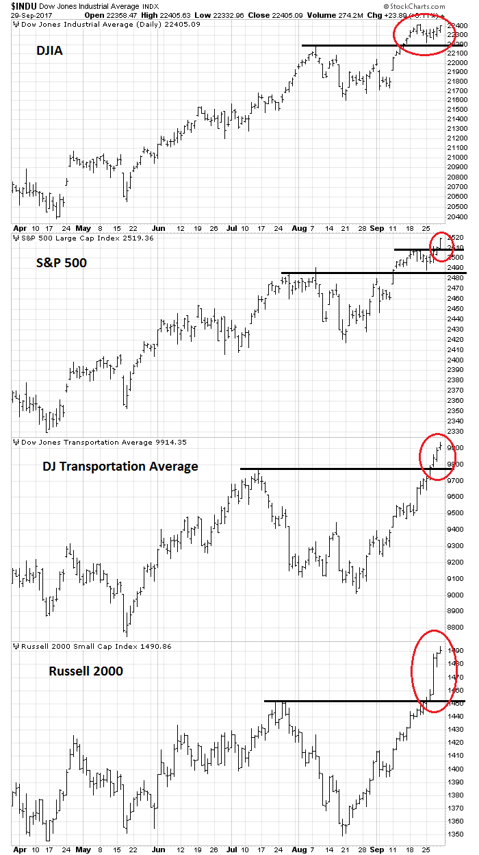The bull case is easy to make. It’s hard to argue against momentum. The major US averages all achieved new highs last week. More importantly, past laggards such as the Russell 2000 small caps, and the DJ Transports (forget any hand wringing over Dow Theory non-confirmation) have hit new highs.