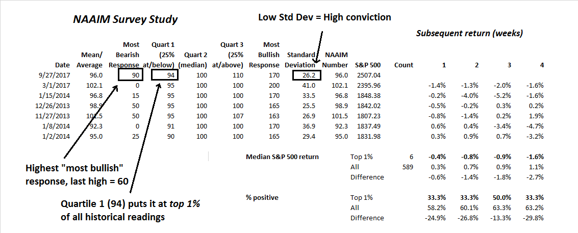 The table below is sorted by the “first quartile” reading, which represents the first quartile of bull/bear responses in the history of the survey. This week’s reading of 94 puts it in the top 1% of bullishness in the entire history of the survey. While the sample size is small (N=6), subsequent returns after such episodes indicate disappointing performance.
