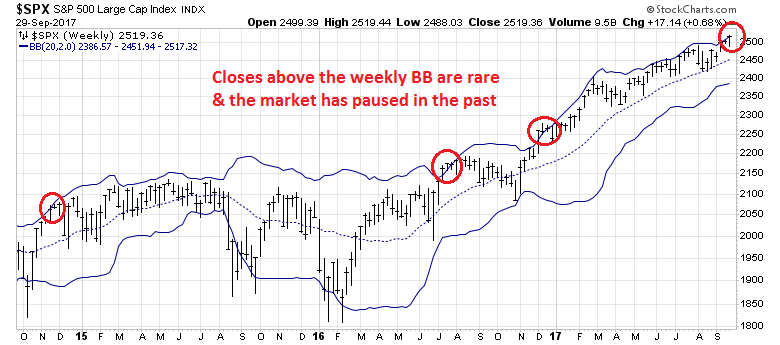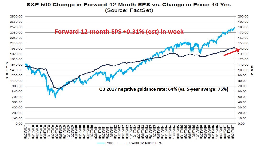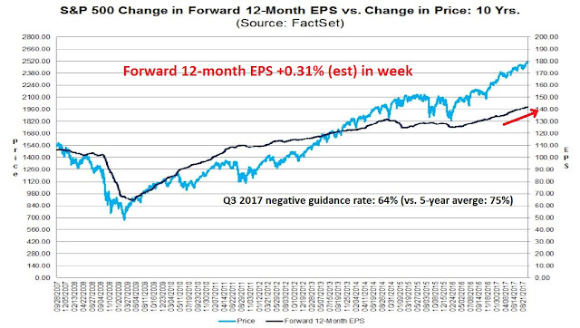 Fundamental momentum is also supportive of the bull case. The latest update from FactSet shows last week’s decline in forward 12-month EPS as a data blip. Forward 12-month EPS is advancing again. As well, the lower than average rate of Q3 2017 guidance is a positive sign for earnings season, which is about to start.