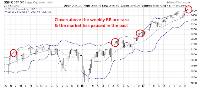 In the short term, however, sentiment is a little overdone, and the market has become overbought very quickly. The SPX closed above its upper Bollinger Band. In the past, such episodes has seen the market pause and consolidate its advance.