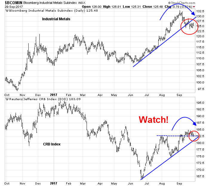 Commodity prices are also starting to roll over. In particular, industrial metals have breached an uptrend, which is worrisome. The CRB Index has been strengthening recently because of the rise in oil prices, but that index is also showing signs of weakness and testing a key support level.