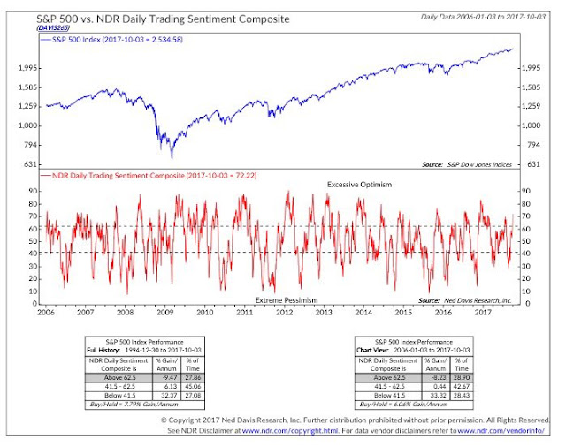 From a short-term viewpoint, sentiment is getting a little giddy and short-term upside potential may be limited. Ned Davis Research`s Trading Sentiment Composite is in the excessive optimism zone. Historically, the market has struggled when readings have been this high.