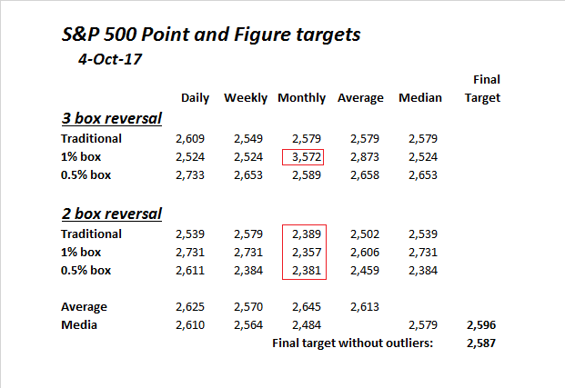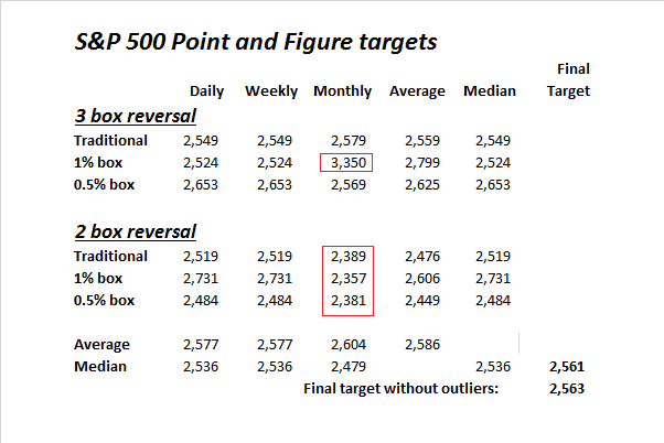 Mid-week market update: Back on July 19, 2017, I wrote about using point and figure charting as a way of projecting an upside SPX target when the index stood at 2473 (see What’s the upside target in this rally?). Using different sets of inputs that represent different time horizons and risk tolerances, I arrived at a target range, and a median upside target of 2561. The final targets were roughly the same whether outliers (highlighted in red) were removed or not.