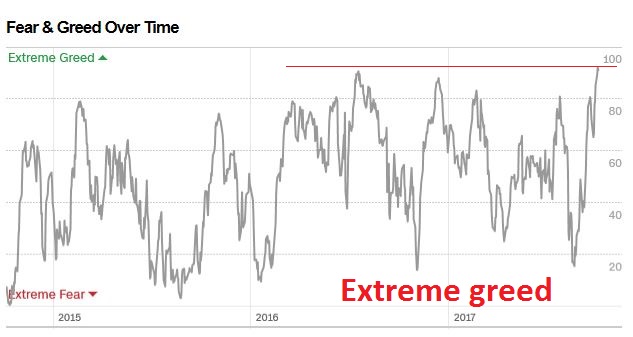 The Fear and Greed Index exceeded 90 this week, which represents an extremely greedy reading. Even if you are bullish, are you sure you want to be buying here?
