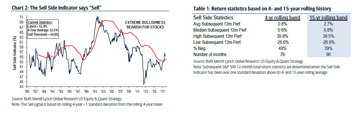 Current readings are at a crowded long: “The current indicator near a six-year high, it is nearly two standard deviations above the four-year average, suggesting weaker returns over the next 12 months”. Note that the backtested results in the table below shows returns when they are 1 standard deviation above the 4-year average.