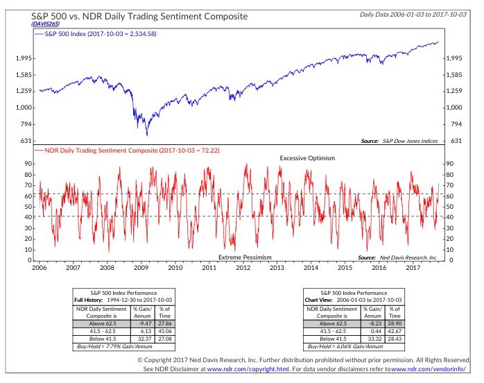 From a short-term viewpoint, sentiment is getting a little giddy and short-term upside potential may be limited. Ned Davis Research`s Trading Sentiment Composite is in the excessive optimism zone. Historically, the market has struggled when readings have been this high.