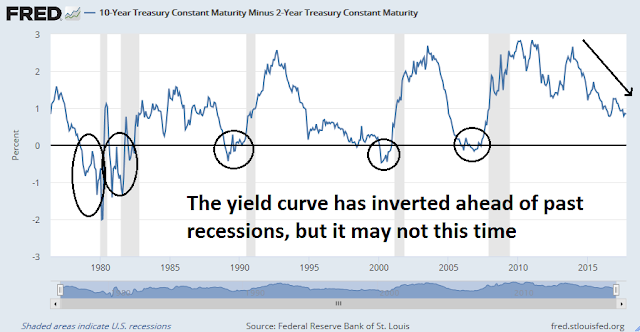 I have been making the point that the American economy is in the late stages of an expansion. This presents some investment challenges as an inflection point may be near. As the chart below shows, while every equity downdraft has not signaled a recession, every recession has seen an equity bear.