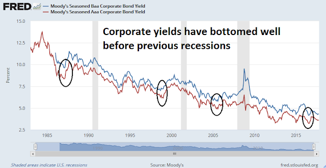 As well, the debt financing costs of corporations have bottomed for this expansion. Corporate bond yield bottoms have generally occurred ahead of past recessions.