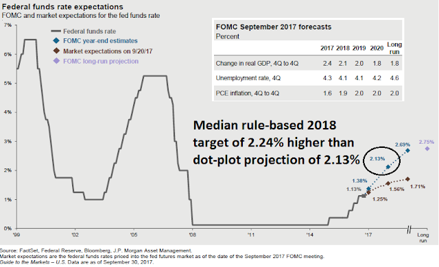That’s just the base case scenario. I pointed out in my last post (see Market melt-up and crash?) that the FOMC is likely to adopt a more hawkish tilt in 2018, irrespective of the identity of the chair. Virtually all Fed governor candidates favor rules-based approaches to monetary policy, which would put the Fed on a more hawkish path than it is today. As well, the rotation of votes among regional Fed presidents indicate a more hawkish shift, from Evans and Kashkari to Meester and Williams.