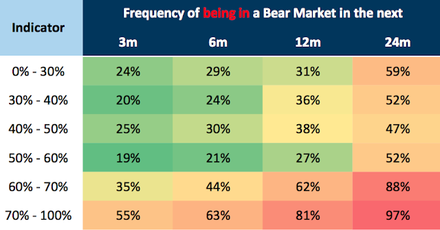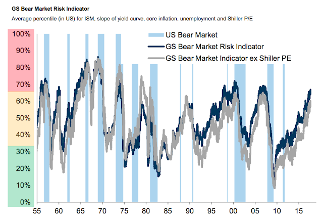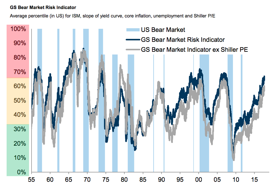 The GS Market Risk Indicator has risen to levels seen at previous tops and stands at 67%, which indicates that there is an 62% chance that US equities will enter into a bear market within 12 months, and 88% chance of a bear market within 24 months.