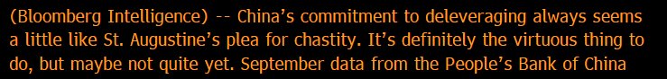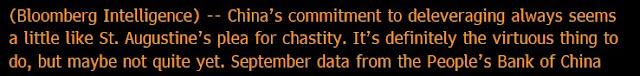 Despite the widespread concerns about the extended state of China’s debt levels and the lip service paid to deleveraging, Chinese authorities have been juicing the Chinese economy with credit driven growth ahead of the Party Congress. Tom Orlik had the perfect observation that describes China’s deleveraging efforts.