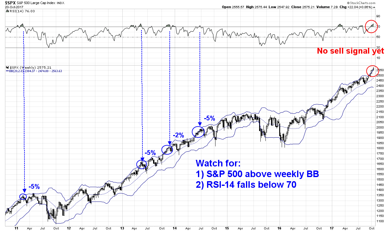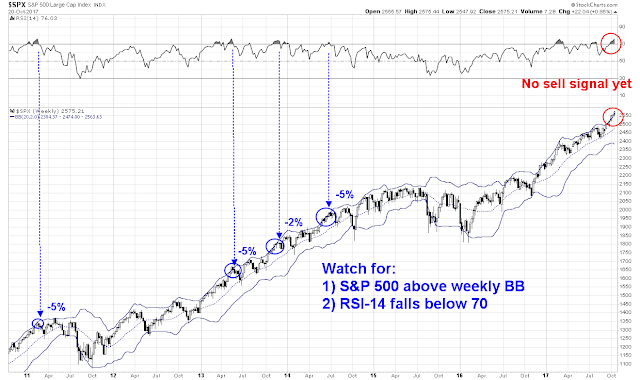 Any early warning of a downside break should come from the daily chart. It would be seen first from RSI-5, followed by RSI-14. Neither has happened.