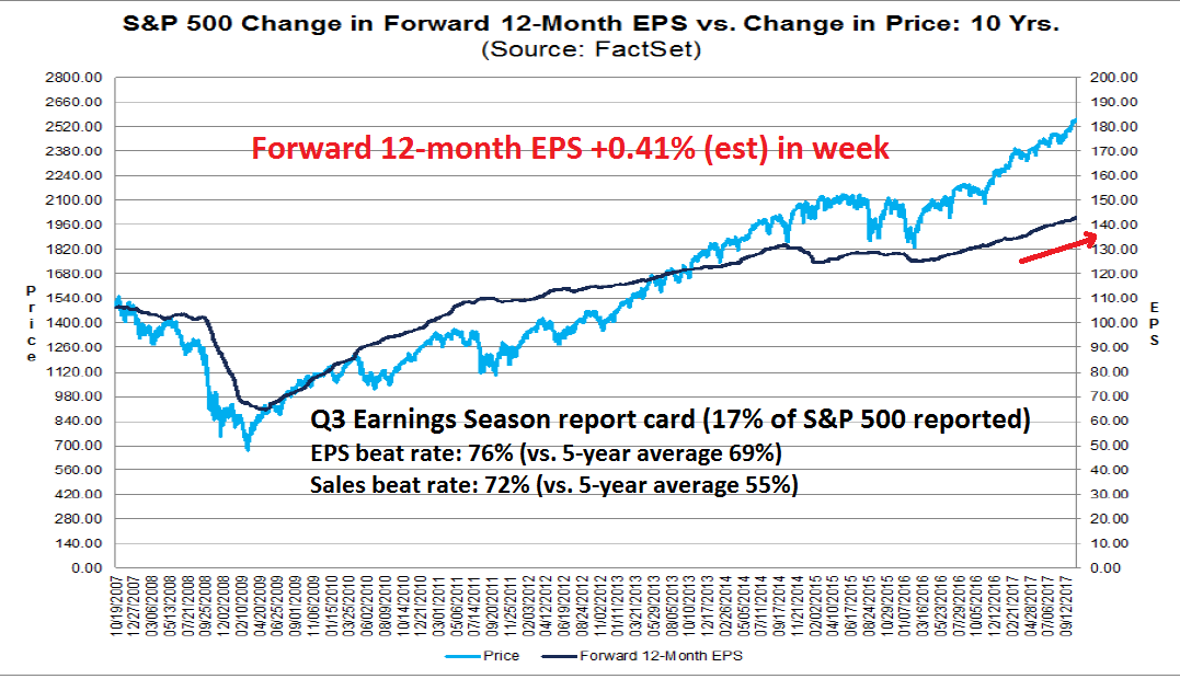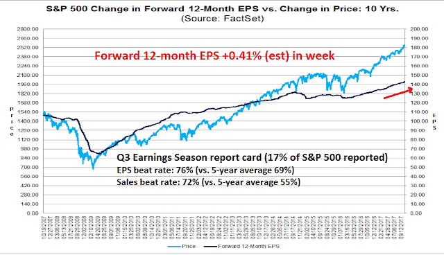 In the meantime, the stock market has not crossed my bearish lines in the sand. The latest update from John Butters of FactSet shows that Q3 earnings season results are beating both the top and bottom lines at an above average historical rates. Forward 12-month EPS is still rising, which indicates positive fundamental momentum. Butters also stated that “the market is rewarding upside earnings surprises more than average and punishing downside earnings surprises more than average”, which is an important indication of bullish undertones to market psychology.