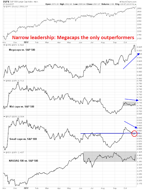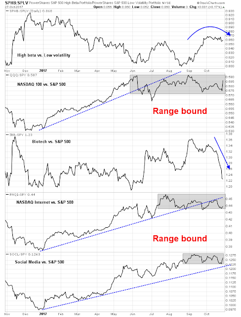 An analysis of the relative performance of high beta groups tells a similar story. The relative performance of the High beta ETF (SPHB) vs. the Low volatility ETF (SPLV) appears to be rolling over. Except for the Social Media stocks, which is dominated by FB, the relative performance of all other groups, namely Biotech, NASDAQ Internet, and NASDAQ 100, are either rolling over or range bound.