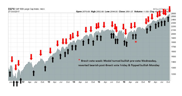 My inner trader uses the trading component of the Trend Model to look for changes in the direction of the main Trend Model signal. A bullish Trend Model signal that gets less bullish is a trading “sell” signal. Conversely, a bearish Trend Model signal that gets less bearish is a trading “buy” signal. The history of actual out-of-sample (not backtested) signals of the trading model are shown by the arrows in the chart below. Past trading of the trading model has shown turnover rates of about 200% per month.
