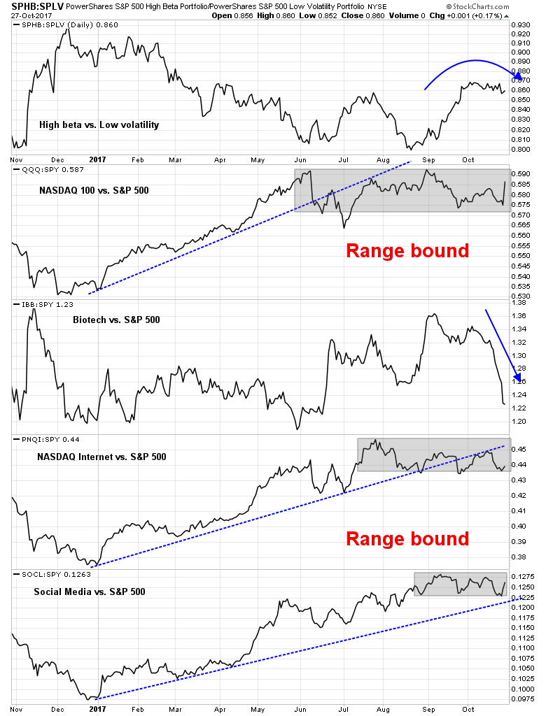 An analysis of the relative performance of high beta groups tells a similar story. The relative performance of the High beta ETF (SPHB) vs. the Low volatility ETF (SPLV) appears to be rolling over. Except for the Social Media stocks, which is dominated by FB, the relative performance of all other groups, namely Biotech, NASDAQ Internet, and NASDAQ 100, are either rolling over or range bound.