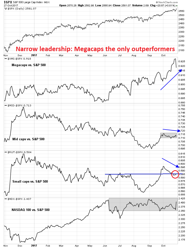 From a technical perspective, the equity outlook is equally fragile. Last week’s advance was accomplished with evidence of narrow breadth. Leadership was only provided by the megacap stocks. The mid caps, small caps, and even NASDAQ 100 stocks were either range bound or declining relative to the SPX.