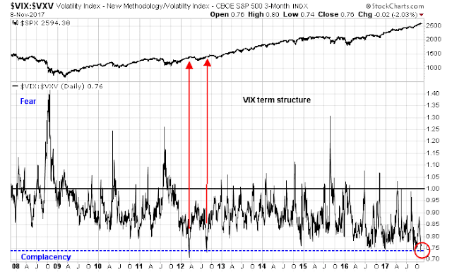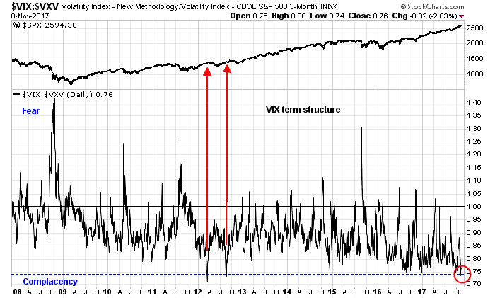 In addition, there are signs of complacency showing up in the option market. While the low level of the VIX Index is a concern, the term structure of the VIX has steepened to historical extremes, indicating excessive bullishness.