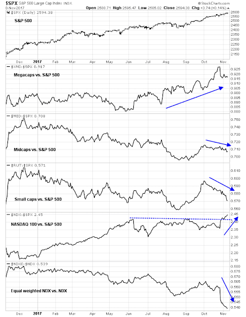From a technical perspective, the market does not look healthy. The recent advance is characterized by extremely narrow leadership of megacap and large cap NASDAQ stocks. Both mid and small cap stocks are underperforming, and the equal-weighted NASDAQ 100 (NDX) is tanking against the cap weighted NDX.