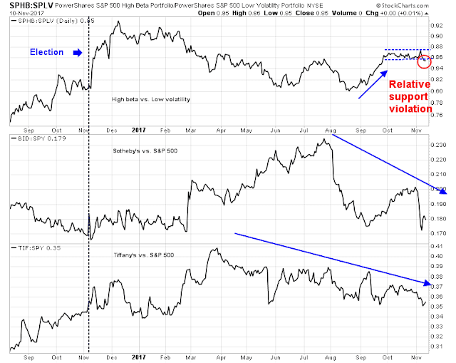 Even before stock prices got spooked, the market showed signs it was ready to go down. There were cautionary signals from risk appetite indicators, which signaled rising skepticism over the passage of any tax bill. The top panel depicts the relative performance of high beta vs. low volatility stocks as a metric of risk appetite. Risk appetite perked up in September as the odds of a tax cut became more likely, then flattened out into a range. This pair broke down through a relative support on Friday. The other pairs show the relative performance of “champagne” stocks Sotheby’s (BID) and Tiffany’s (TIF) against the market. The “champagne” stocks have been underperforming the market for the last few months, which is another sign of market skepticism that much was going to be accomplished on the tax bill.